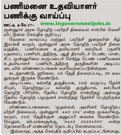 - Further any help please contact the Principal, Govt ITI Coonoor, The Nilgiris 643 101. Telephone Number 0423-22231759
